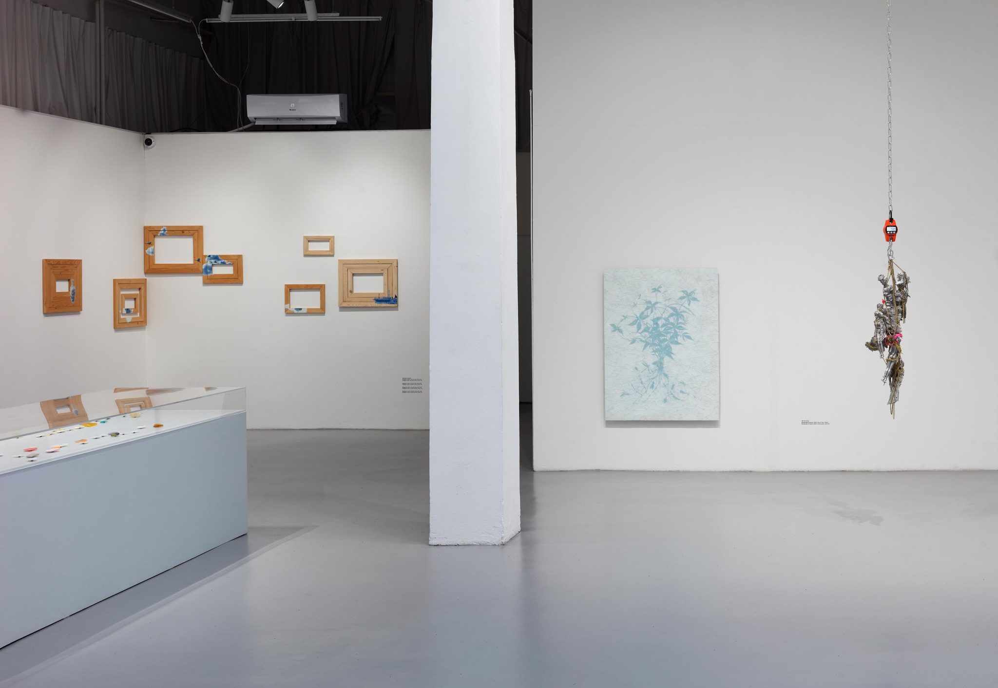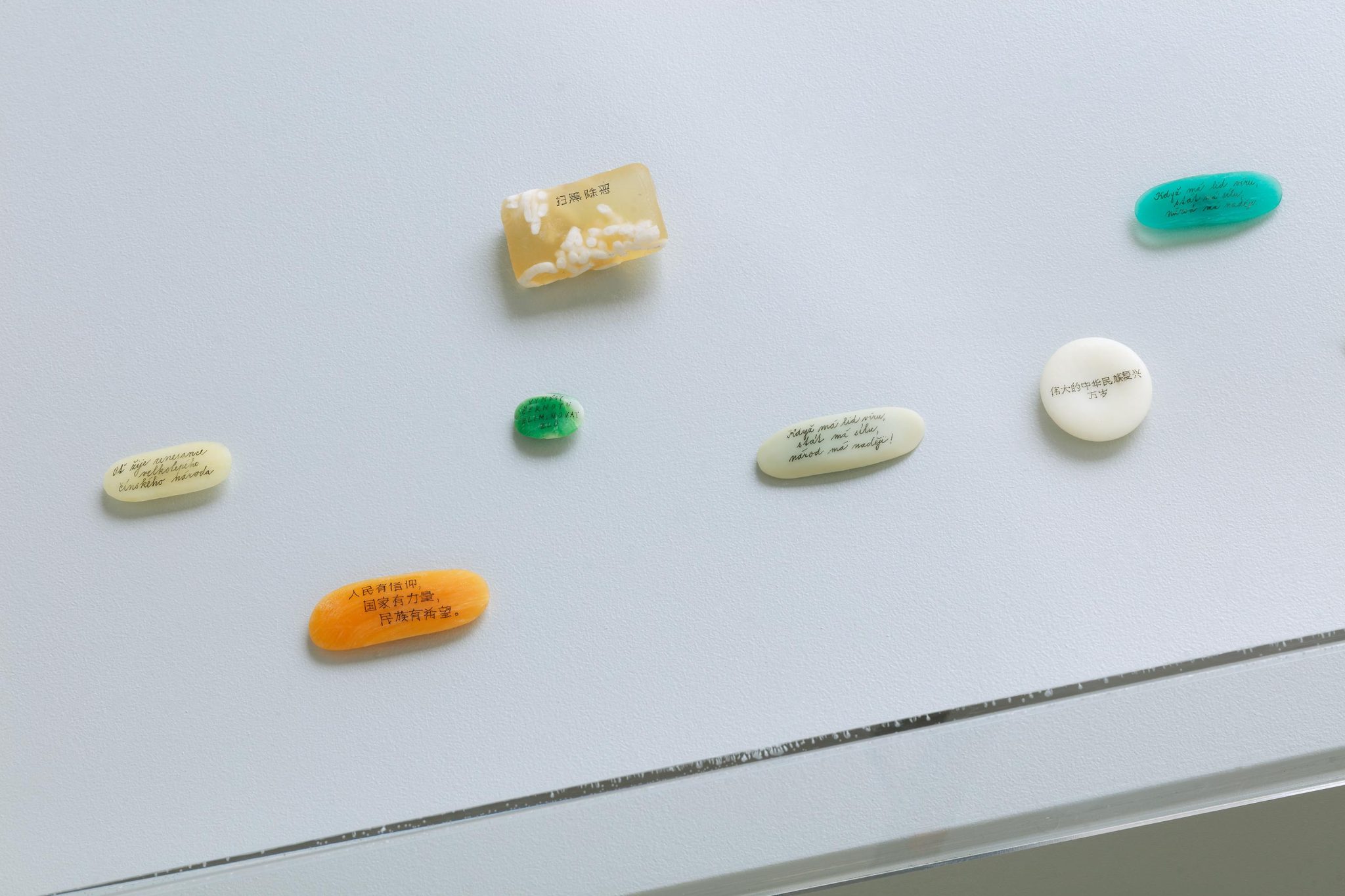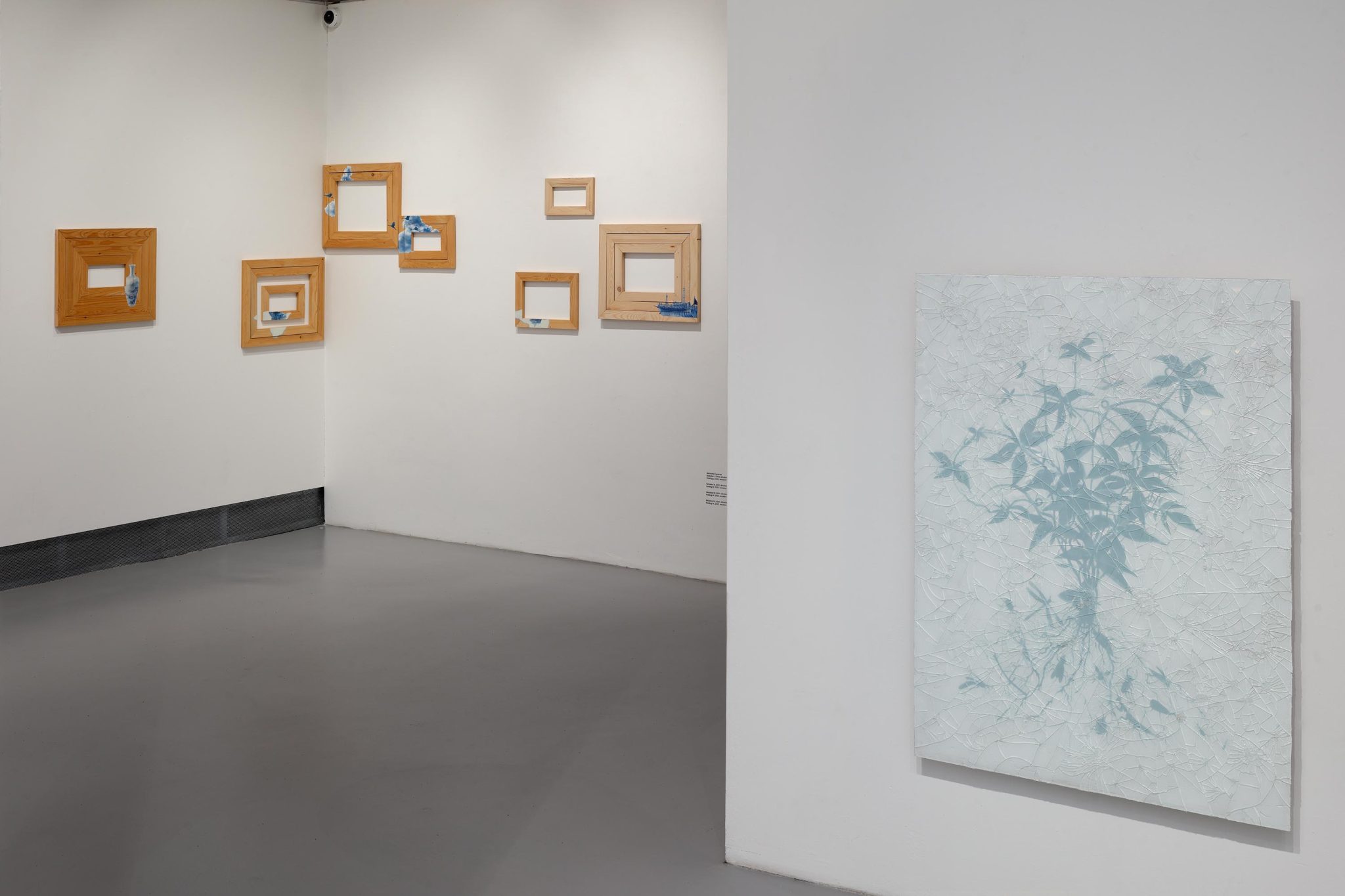 The exhibition at Trafo Gallery thus presents two seemingly unrelated bodies of work, which nevertheless share common elements: forms that do not overwhelm us with garishness but with hidden depth; ambiguous themes that are sometimes only appreciated from a distance; and a shared ability to transform everyday reality into scenes of extraordinary impact. The unifying element of the works on show is provided by inconspicuous qualities, marginal phenomena, details. The colour white predominates. The perception of individual works often requires that the viewer zoom in and examine them closely. This might involve tiny objects with even tinier interventions, images that are only visible from a certain angle, or, for example, a video based on a moment as fleeting and difficult to convey as the rapidly melting snow on a car window. The dominant element of Michaela Černická’s series Klínování / Wedging is the supporting structures of the paintings, on which the painted gussets of the stretched frame seem to parasitise. Jiří Černický’s dangerous Ostré vločky / Sharp Snowflakes disappear on the wall and a jewellery-like display cabinet hides used condoms made of glowing semi-precious stones. Michaela Černická’s Smývání / Washing levitate in a display case, washed through use into delicate semi-transparent ovals.