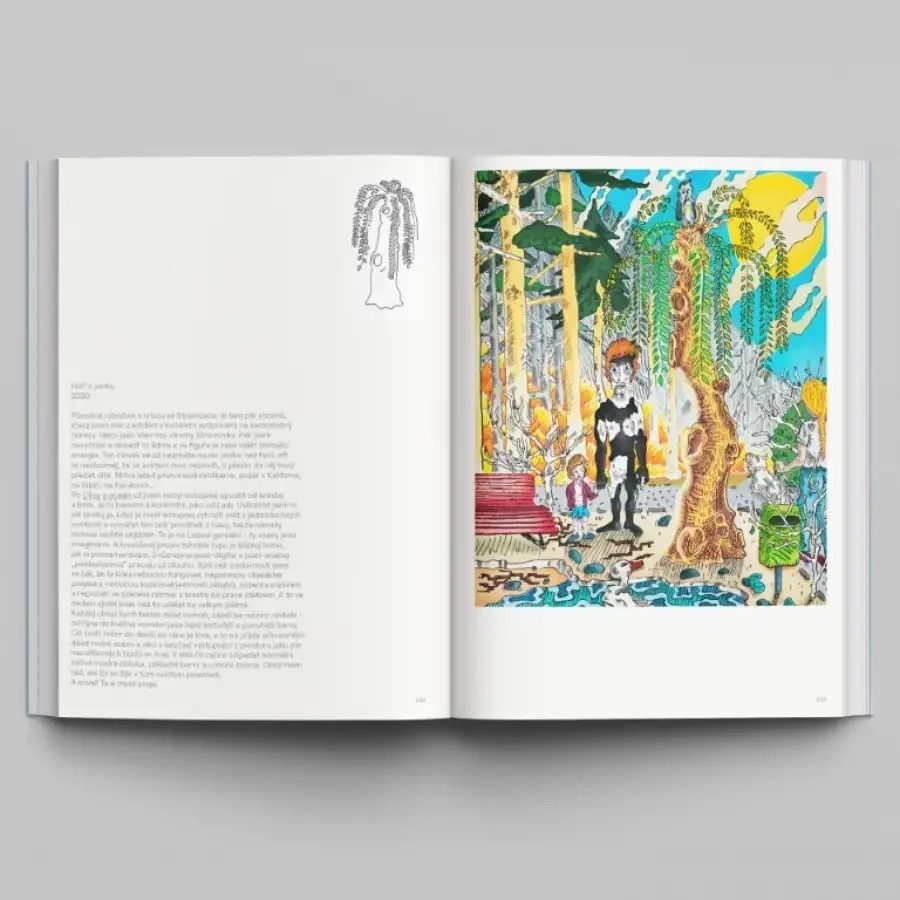 In Matuška's first extensive, large-format retrospective, the coming-of-age story of one of the most successful painters of his generation takes shape through more than a hundred paintings, as well as sketches, drawings and his own comments. From the beginnings of a graffiti writer at AVU and a baseball player in a white cube, through the lonely browsing of digital tools, to the defining holistic experience, parenthood and momentary active solitude, the technical, motivational and intellectual maturation and layered (self) portrait of the ironic/poetic glossator and his supremely distorted a handwriting that can draw from animated series as well as Renaissance masters. Along with the first fifteen years of painting, the book also culminates fifteen years of conversations with permanent collaborator Michal Nanoru, which in 2021 resulted in six months of intensive meetings in the studio and hours of recordings. Two lines of Matuška's speeches, in which the author's ability to informally aptly name is preserved, reveal the background of the selected paintings and point to more general themes such as Fluidity, Deformation, Light, Fear, Body and Nudity or Cows and Bulls. An omnipresent grotesque, a struggle with one's own ambition, a constant tension between the spontaneity of pen drawings and bright large-scale canvases, between iPad and acrylics, boyishness and calendar, modesty and messiahship, commitment and melancholy, dialectics and bipolarity, but above all passion for one's own medium, sensitivity to social the movements and persistent search for meaning emerge from the interlaced composition of commentary and work that quickly spread among collectors and may never find their way back.