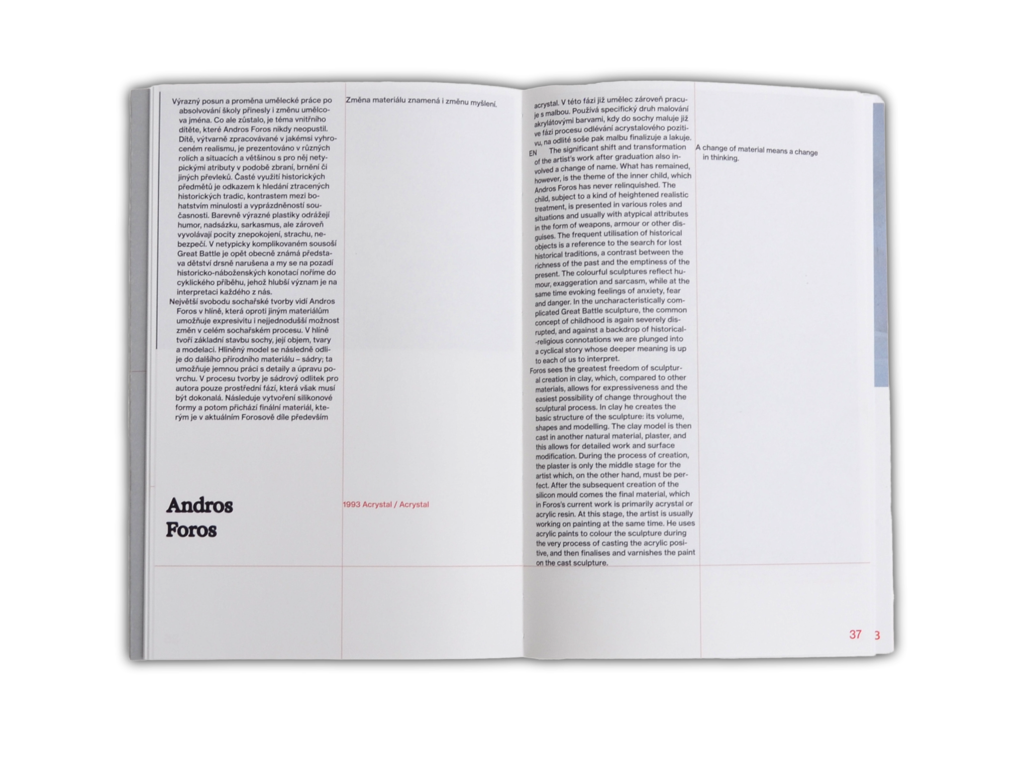 Katalog k sochařské výstavě 14 umělců ze současné široké české sochařské scény. Pojítkem výběru sochařů a sochařek je primární zaměření autorů na figurativní sochu a důraz na šíři a pestrost materiálu, se kterým pracují. Právě materiál – hmota – určuje charakter díla každého z nich. Ať už sochař klade větší důraz na řemeslo či preferuje volnější experiment, navrací se k historickým technikám nebo využívá moderní technologie, vždy danému materiálu vdechuje svým přístupem nový život. Vybraní sochaři pracují s kovem, keramikou, voskem, sklem, mramorem, porcelánem, sádrou či betonem, nicméně v duchu zažité formule „prach jsi a v prach se obrátíš“ se většina autorů odvolává na hluboký význam prvotního materiálu, který je základem všeho. A tak se skrze jejich dílo neustále navracíme k mytické postavě Golema stvořeného z hlíny, kterého lze oživit jediným způsobem. Tím, že do dané hmoty vložíme duši.