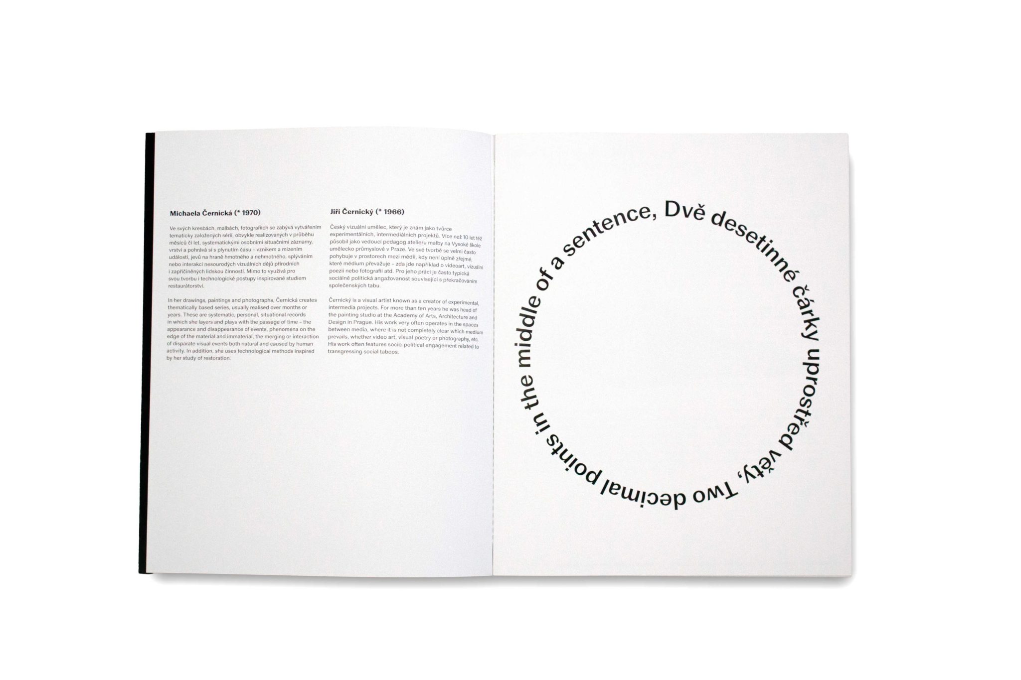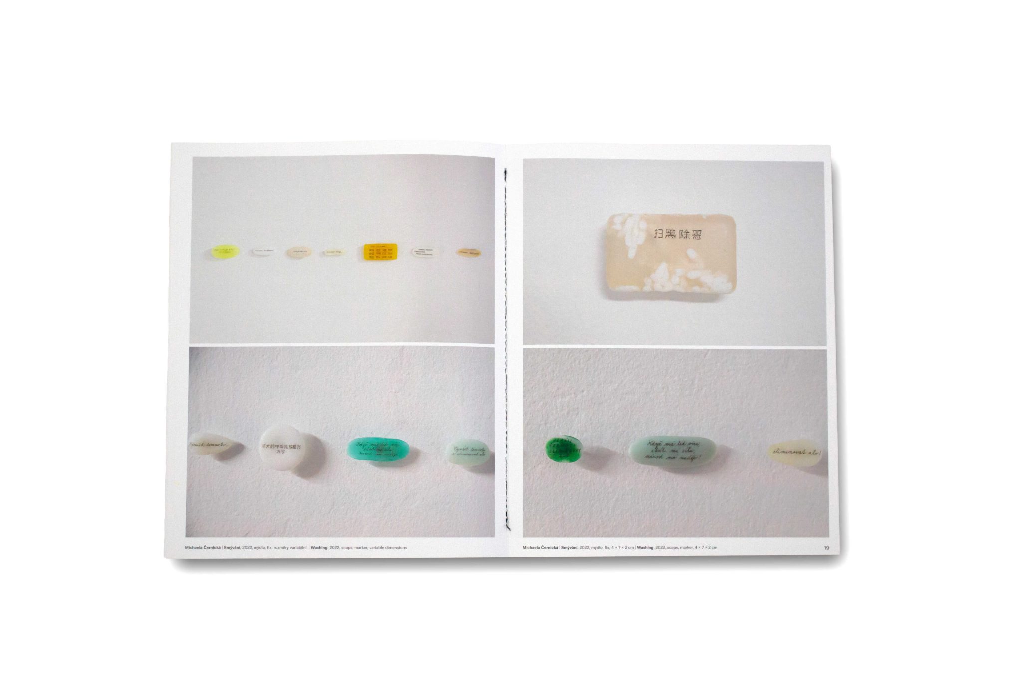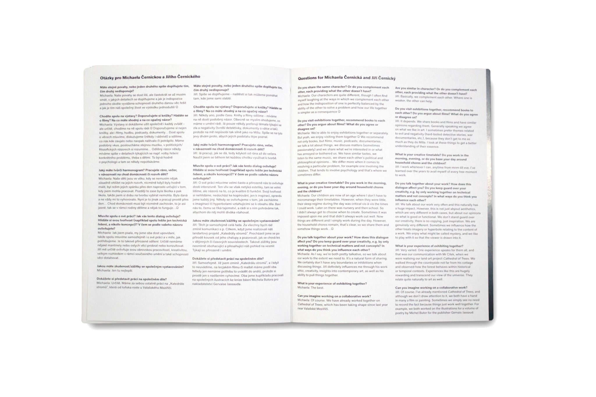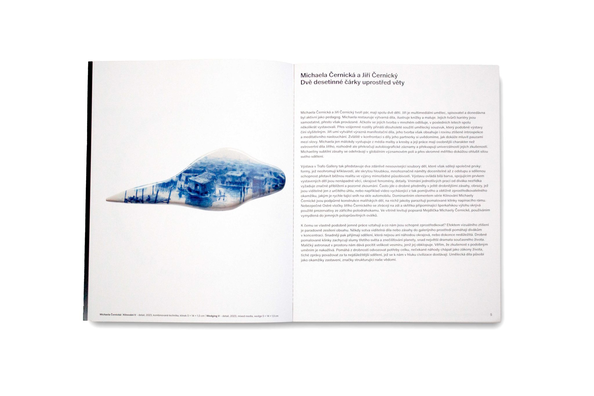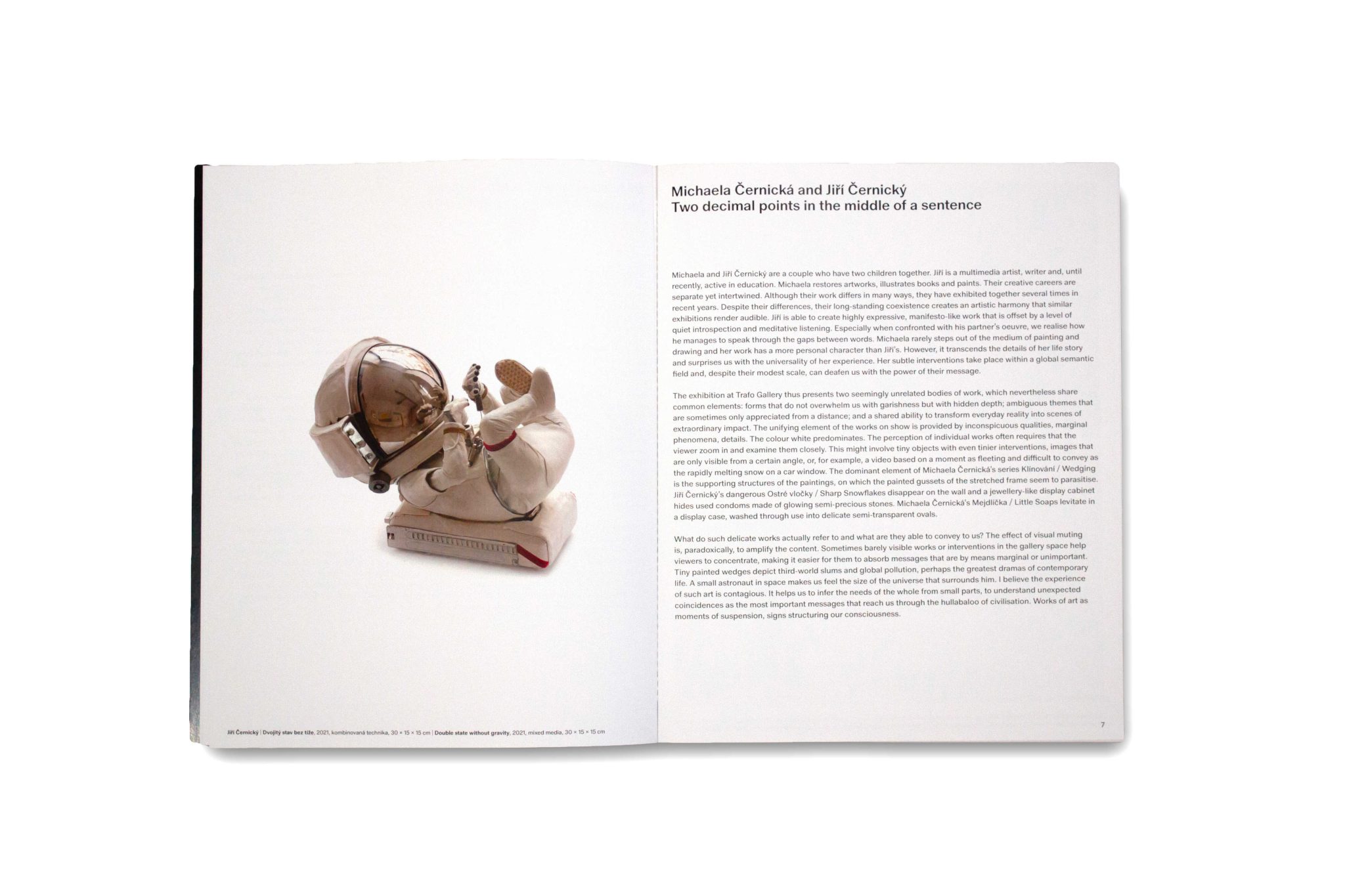 Doprovodný dvojjazyčný katalog se dvěma druhy obálky ke stejnojmenné výstavě umělců Michaely a Jiří Černických v Trafo Gallery.